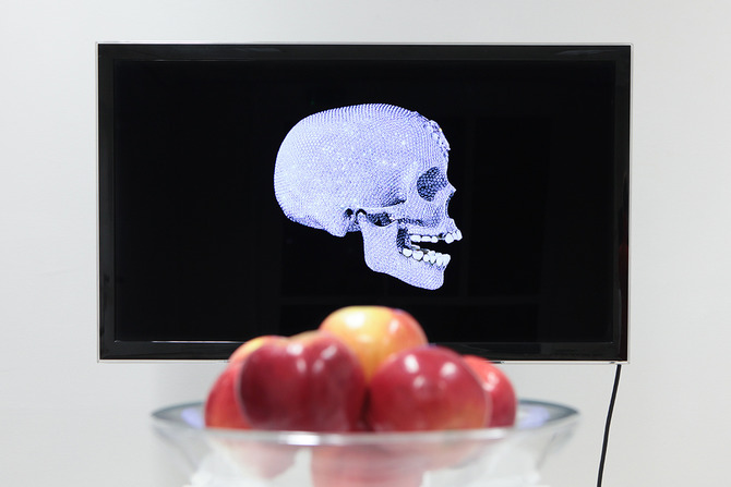 A pedestal holds a glass bowl full of apples. As time passes the apples begin to rot and loose weight. The pedestal measures the weight of these apples, and lowers the opacity of the image on the screen.